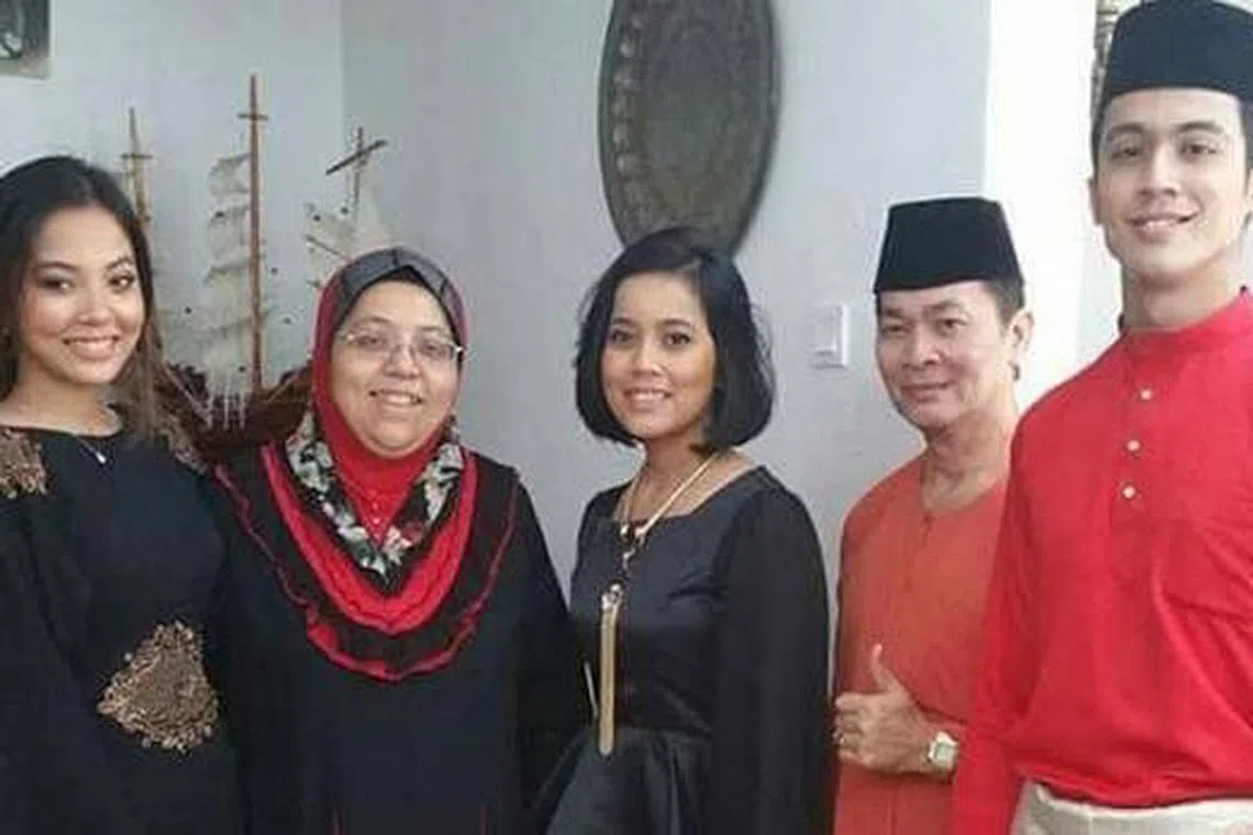 HARMONI SEKELUARGA: Walau bermacam pandangan negatif dilemparkan kepada keluarganya. Cik Siti Hafiza (dua dari kiri) bersama suami, Encik Aziz Sapdan (dua dari kanan), dan anak-anak mereka, Aisyah (kiri), Nur 'Ain dan Aliff, tetap gembira kerana hubungan keluarga mereka tetap utuh. - Foto ihsan SITI HAFIZA SHEIKH MOHAMAD -