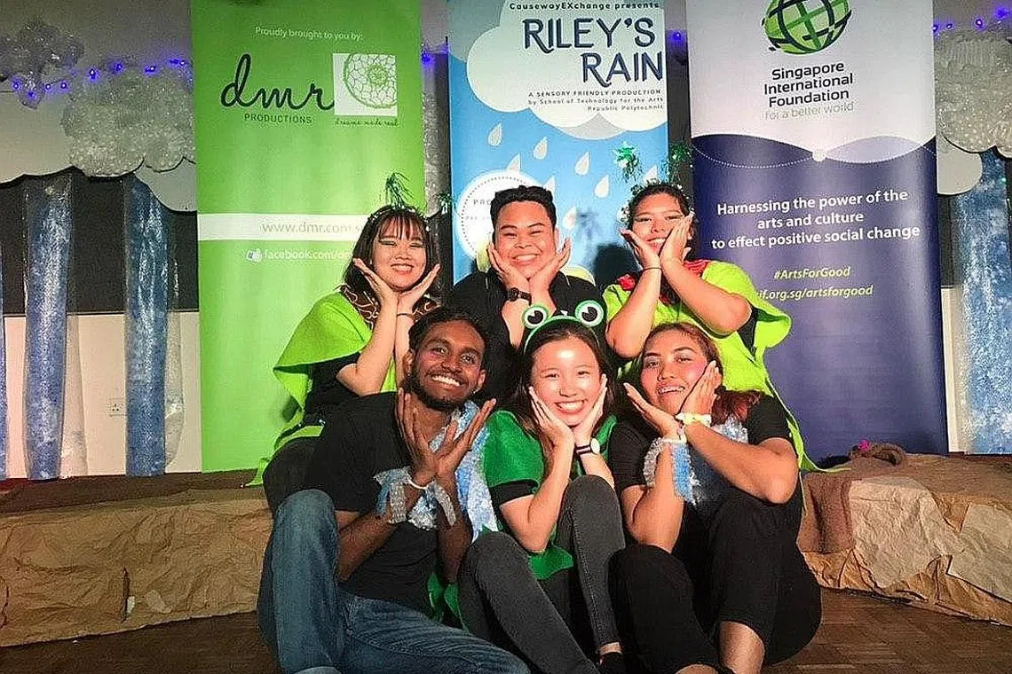 BERBAKTI DENGAN SENI: Encik Muhammad Aniq Danish Shukor (barisan kedua, dua dari kiri) dan rakan-rakannya menerbitkan pementasan teater berbilang deria, Riley's Rain, buat kanak-kanak autisme sempena pesta seni The Causeway EXchange di SIngapura, Johor dan Kuala Lumpur. Foto ini dirakam pada 14 September 2019. - Foto ihsan MUHAMMAD ANIQ DANISH SHUKOR -