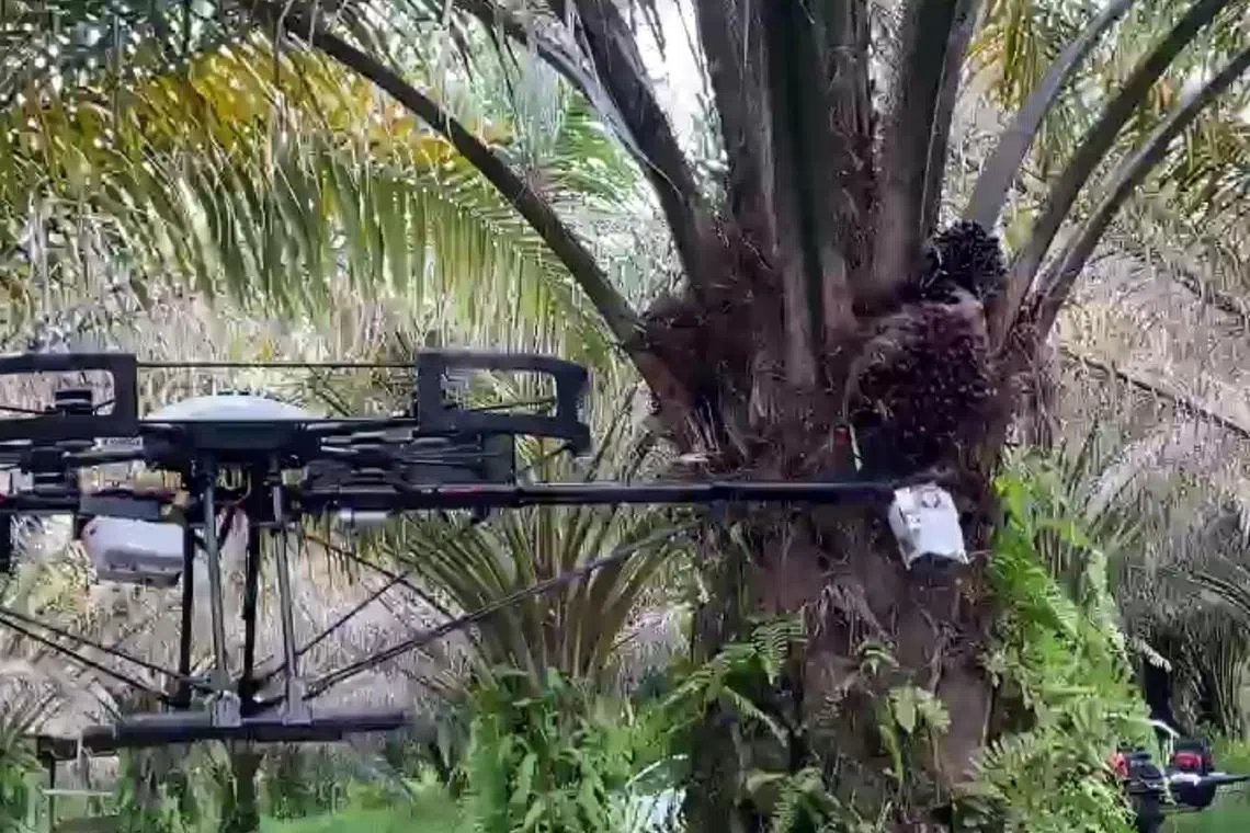 Syarikat Malaysia Kambyan Network telah membangunkan dron yang boleh memotong buah kelapa sawit dari pokoknya. - Foto KAMBYAN NETWORK