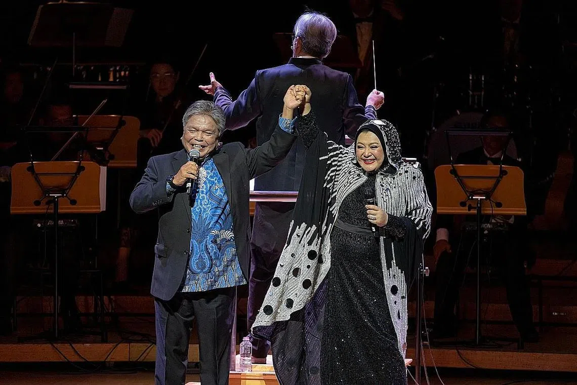 SUSURI JALAN KENANGAN: Emilia Contessa (kanan) mengembalikan ingatan penonton konsert Simfoni Keroncong Nusantara pada lagu malar segar yang pernah didendangkan bersama Broery Marantika, Setangkai Anggerek. Gandingannya kini adalah Eddy Ali. - Foto ALOYSIUS LIM -