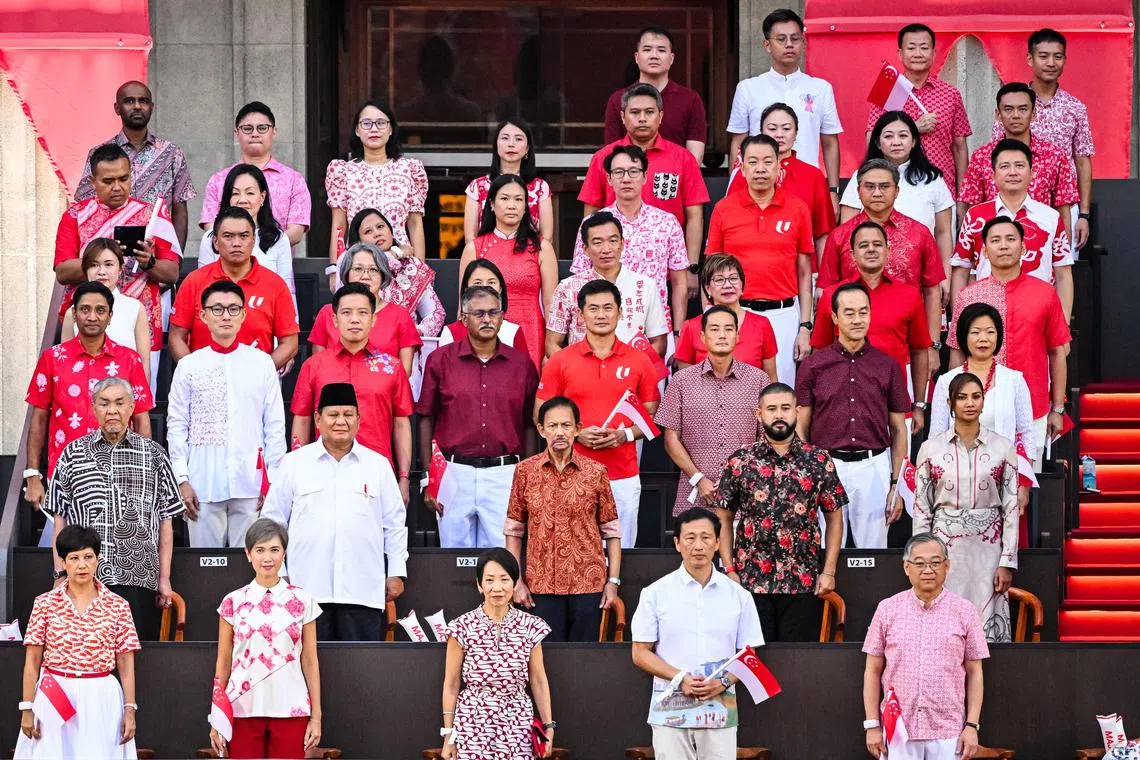 Anggota Parlimen (AP) Singapura turut menggayakan baju bertema merah putih, melambangkan warna bendera negara ini.