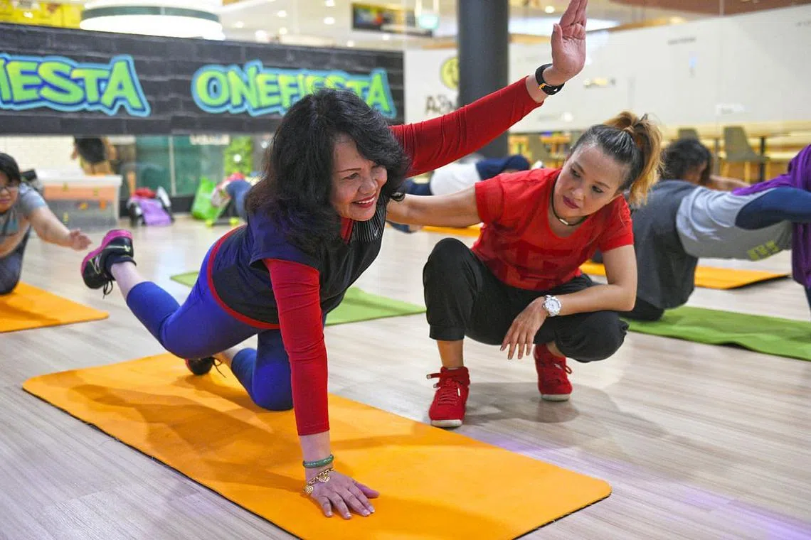 KEKAL AKTIF: Cik Rahmah Rosdi (kiri) giat menyertai kelas senaman kelolaan Cik Dee Dee Mahmod (kanan) di Our Tampines Hub. - Foto BH oleh SAHIBA CHAWDHARY -