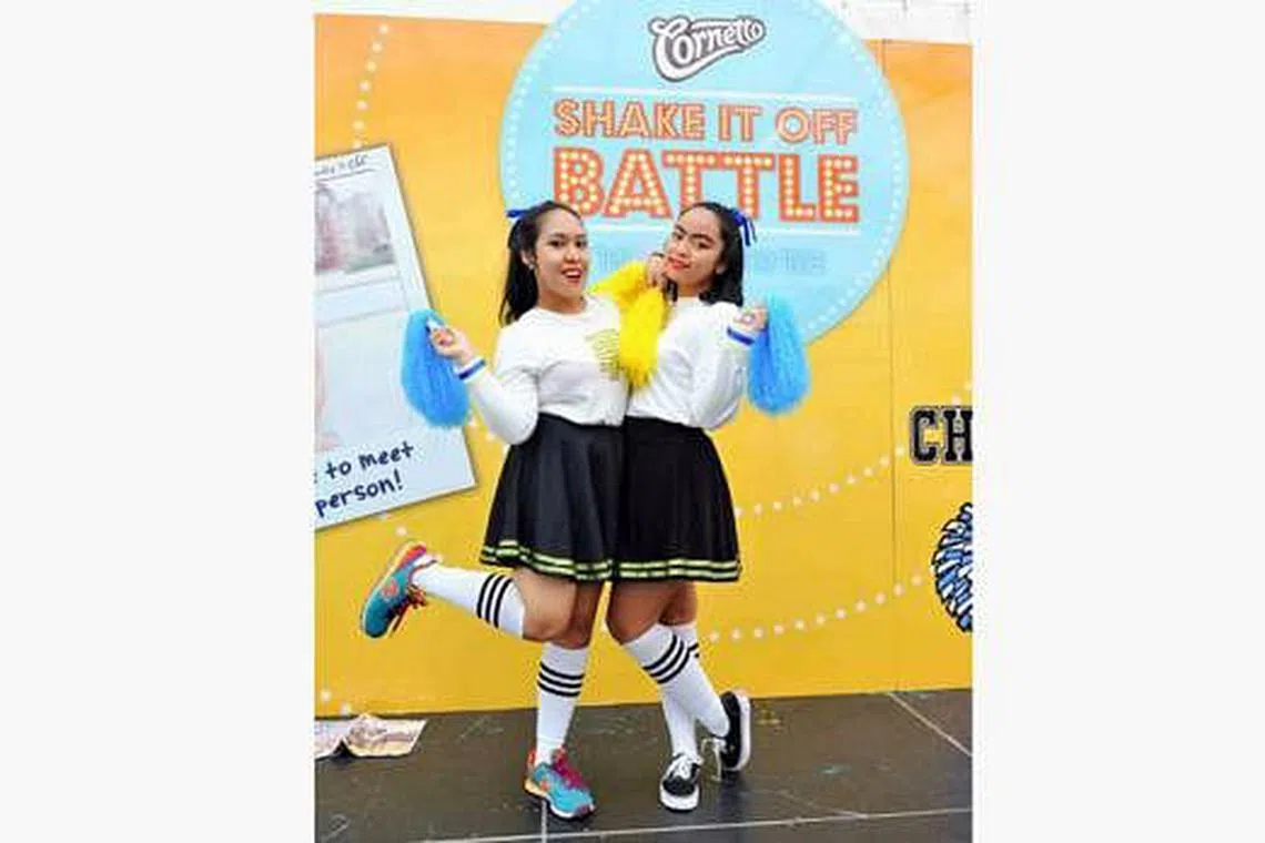 SANGGUP BELAJAR MENARI: Meskipun tidak begitu mahir menari, Iffah Durah Iskandar Dzulkhairi Kajai (kanan) dan Natasha Amaleen Jaafar tetap berusaha mempelajari teknik tarian demi meraih peluang berjumpa penyanyi idola mereka, Taylow Swift. - Foto CORNETTO SINGAPORE -