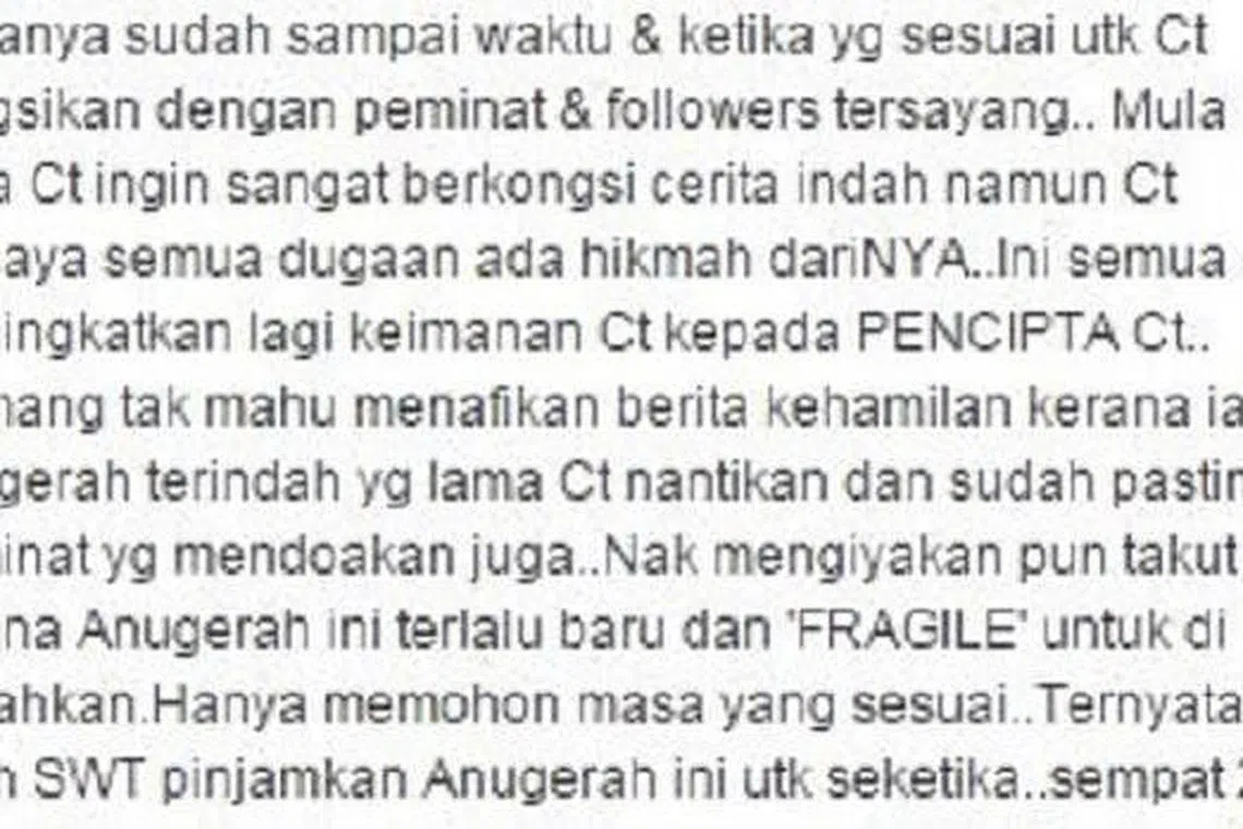 "Pun begitu, untuk mengiyakannya juga takut kerana kandungan ini masih terlalu awal untuk dihebahkan dan Siti mahu menunggu masa yang sesuai.