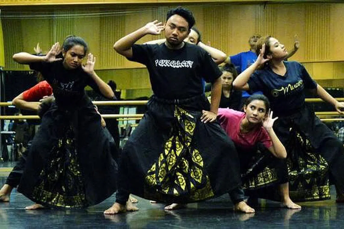 TARIAN KREATIF: Kumpulan tarian Politeknik Republic (RP) Dharma Endari sedang berlatih salah satu tarian yang memberi gambaran kreatif terhadap salah satu daripada lima pancaindera pada acara Chaya - Sinar dan Menyinari nanti. - Foto KHALID BABA -