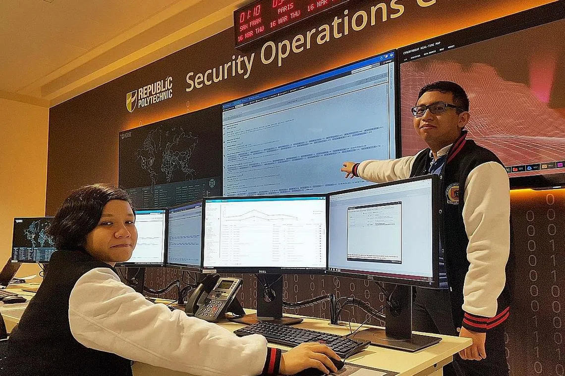 TERUJA TIMBA ILMU: Sebagai belia yang terpaut pada warna-warni dunia siber, Cik Nurul Huda Mohamed Amir dan Encik Hamzah Pinadi berhasrat menceburi bidang forensik digital atau penggodaman beretika selepas tamat pengajian kursus Diploma Pengurusan Keselamatan Infokom di Politeknik Republic. - Foto POLITEKNIK REPUBLIC -
