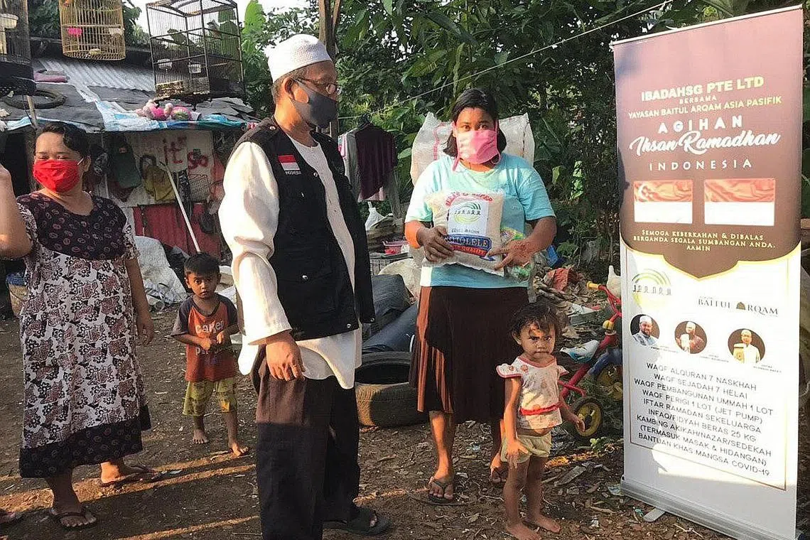 BANTUAN UNTUK SESAMA INSAN: Ibadahsg turut memberi bantuan kepada penduduk bukan Islam seperti di sebuah desa di kawasan Bogor ini, yang penduduk bukan Islamnya terjejas oleh Covid-19. - Foto IBADAHSG. -