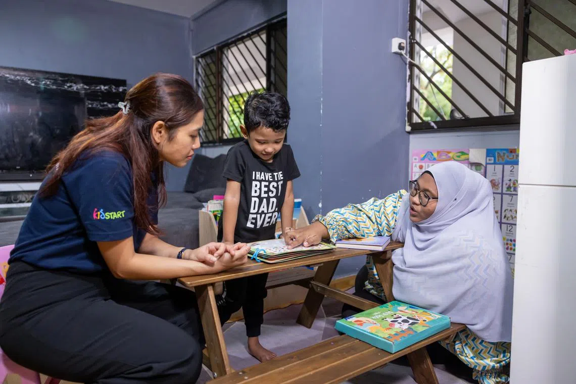 Menurut Cik Siti Fatimah Mohamed Motali (kanan), sejak menyertai program KidSTART dan mendapat bimbingan daripada pengamal KidSTART seperti Cik Azimah Azhar (kiri), anak sulungnya, Sheik Fayyad Sheik Firdaus, enam tahun, telah berubah minat daripada suka menonton televisyen kepada suka membaca. - Foto KIDSTART SINGAPORE