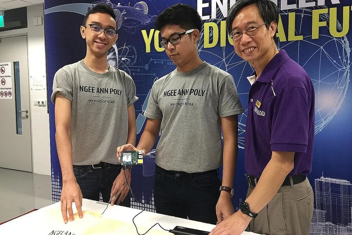 SEJADAH BIJAK: (Dari kiri) Encik Yusuf Musa dan Encik Ryan Aidan Jayasuriya mencipta sejadah bijak yang mampu mengira bilangan rakaat solat menyahut cabaran pensyarah kanan, Encik Low Chee Kin (kanan), agar mencipta produk yang mampu dimanfaatkan masyarakat Islam. - Foto HARYANI ISMAIL -