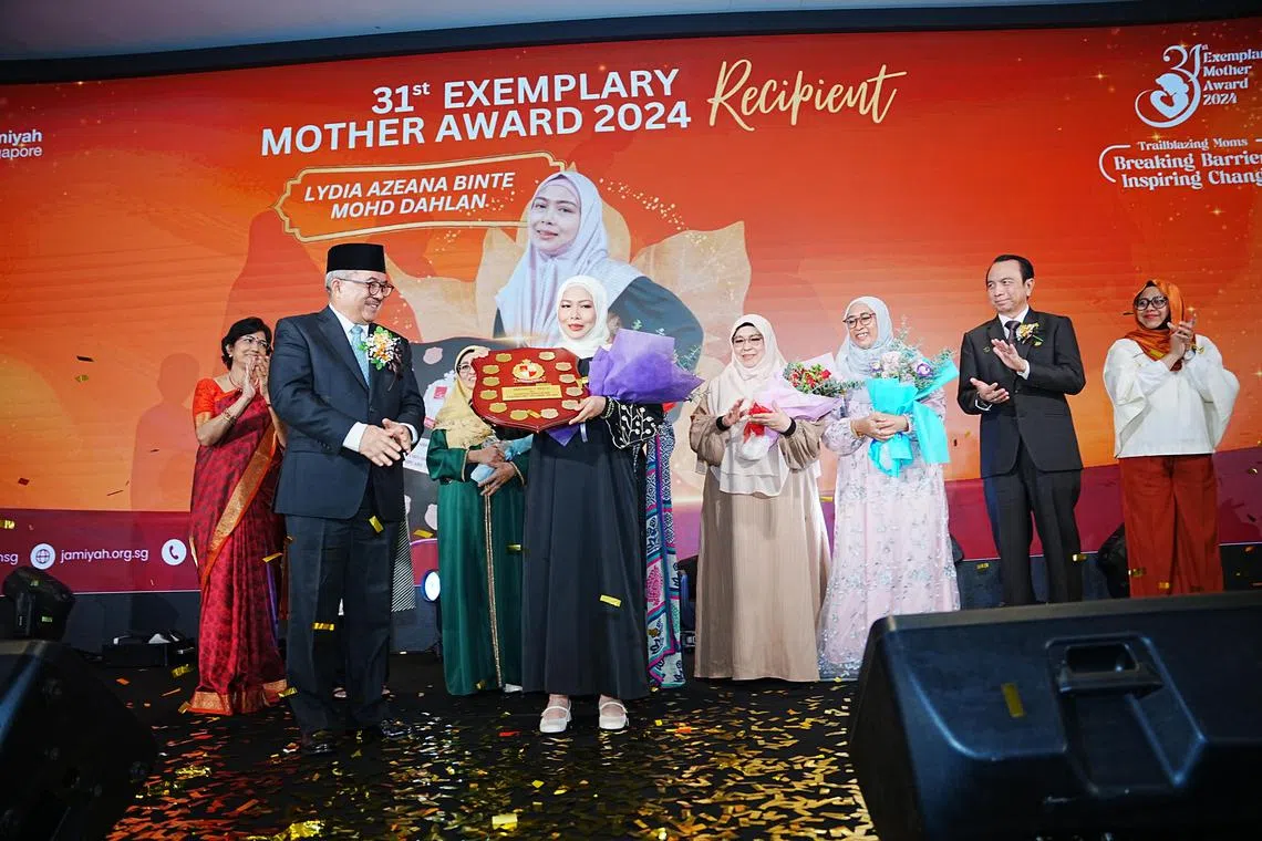 Cik Lydia Azeana Mohd Dahlan (tengah), pemenang Anugerah Ibu Teladan ke-31, di majlis penyampaian yang berlangsung di hotel Hilton Singapore Orchard, menerima hadiah daripada tetamu terhormat, Duta Besar Republik Indonesia ke Singapura, Encik Suryo Pratomo (depan, kiri); disaksikan (dari kanan) Pengerusi Jawatankuasa Wanita Jamiyah Singapura, Cik Roza Ahmad; presiden Jamiyah, Dr Mohd Hasbi Abu Bakar; finalis, Cik Norlia Mohd Ali Marican, Cik Nur’aini Hasan, dan ketua panel hakim, Cik Sarojini Padmanathan. - Foto BH oleh NUR DIYANA TAHA