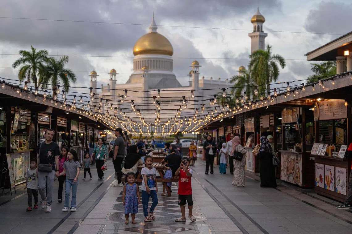 Orang ramai langgani gerai makanan berdekatan Masjid Omar Ali Saifuddien di Brunei pada Januari 2024. - AFP