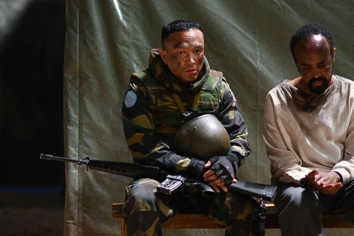 CABARAN BERGOLAK DENGAN EMOSI: Shaheizy Sam (kiri) selaku Lans Koperal Ramlee akui babak interaksi penuh pasang surut emosi dengan pelakon asal Somalia, Musa Aden selaku Abdalle, penterjemah Pertubuhan Bangsa-Bangsa Bersatu (PBB), adalah yang paling mencabar berbanding babak aksi. - Foto GOLDEN VILLAGE