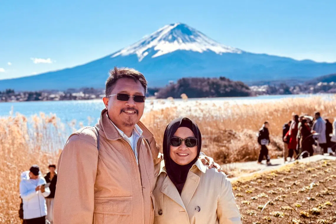 Encik Sarafian Salleh dan isterinya, Cik Norzihan Zainudin, berkunjung ke Taman Oishi berdekatan Mount Fuji pada Januari 2025. - Foto ihsan SARAFIAN SALLEH