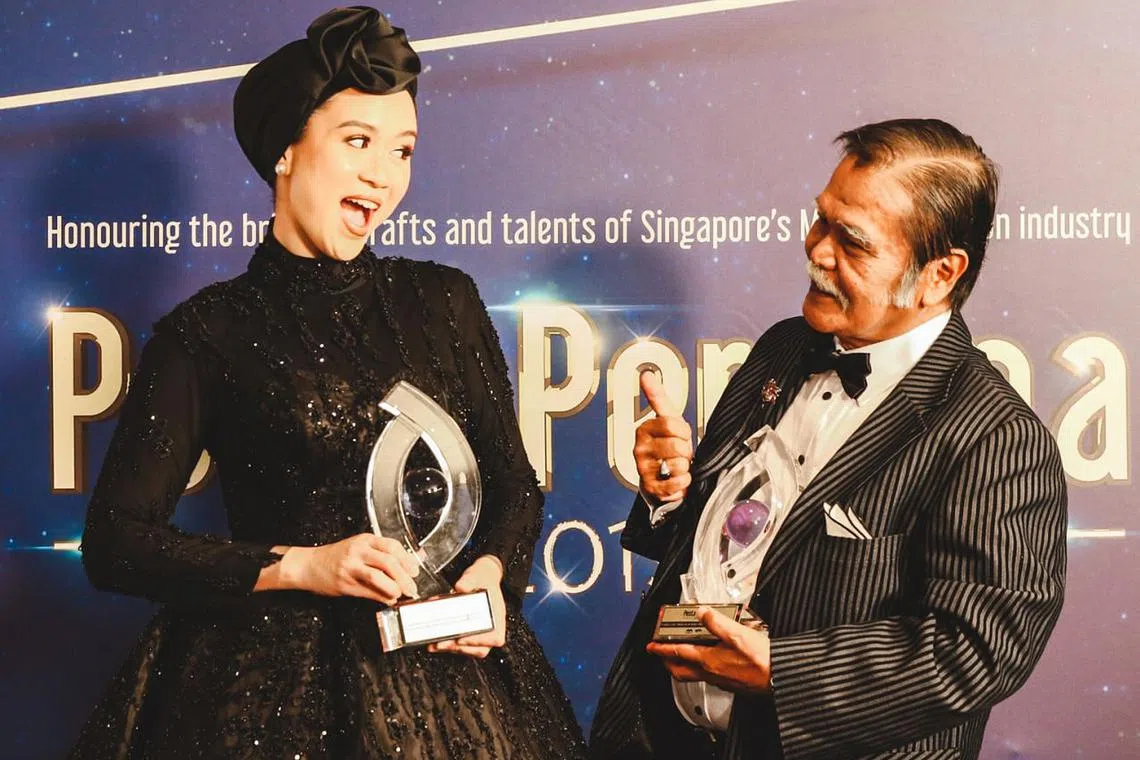 LAKONAN DARI HATI: Pelakon veteran, J.A. Halim (kanan dalam gambar kiri), membawa piala Pesta Perdana bagi kategori Pelakon Lelaki Terbaik dalam Watak Pembantu (Drama Khas/Antologi) manakala menantunya, Fizah Nizam, buat julung-julung kalinya menerima Anugerah Pelakon Wanita Terbaik dalam Watak Pembantu (Drama Bersiri). - Foto BH oleh KHIDHIR ASYRAF MAHBOB -