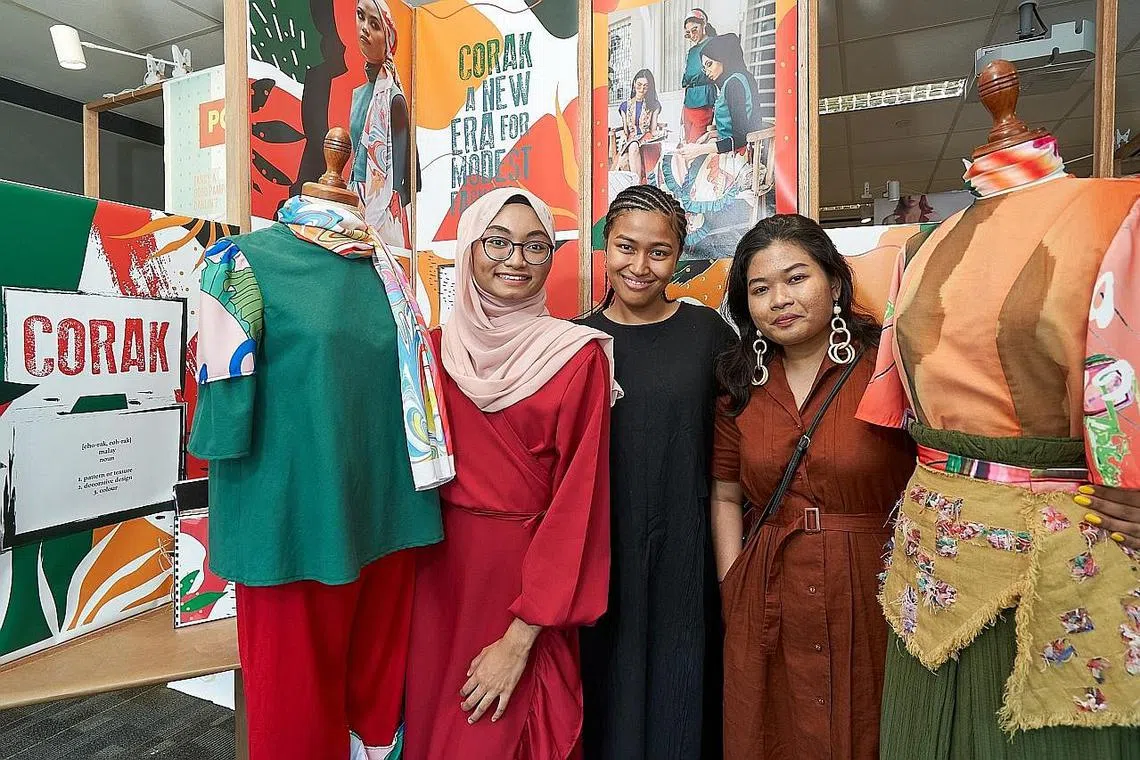 TIGA DARA DAN IMPIAN FESYEN: (Dari kiri) Cik Nur Atiqa Masnizam, Cik Farhana Ahmad dan Cik Tiara Safiah Hamzah mengusahakan jenama 'Corak' bagi projek fesyen tahun akhir mereka yang menekankan konsep 'retro' dan identiti Melayu dalam busana sopan yang memperkasa diri. - Foto POLITEKNIK TEMASEK -
