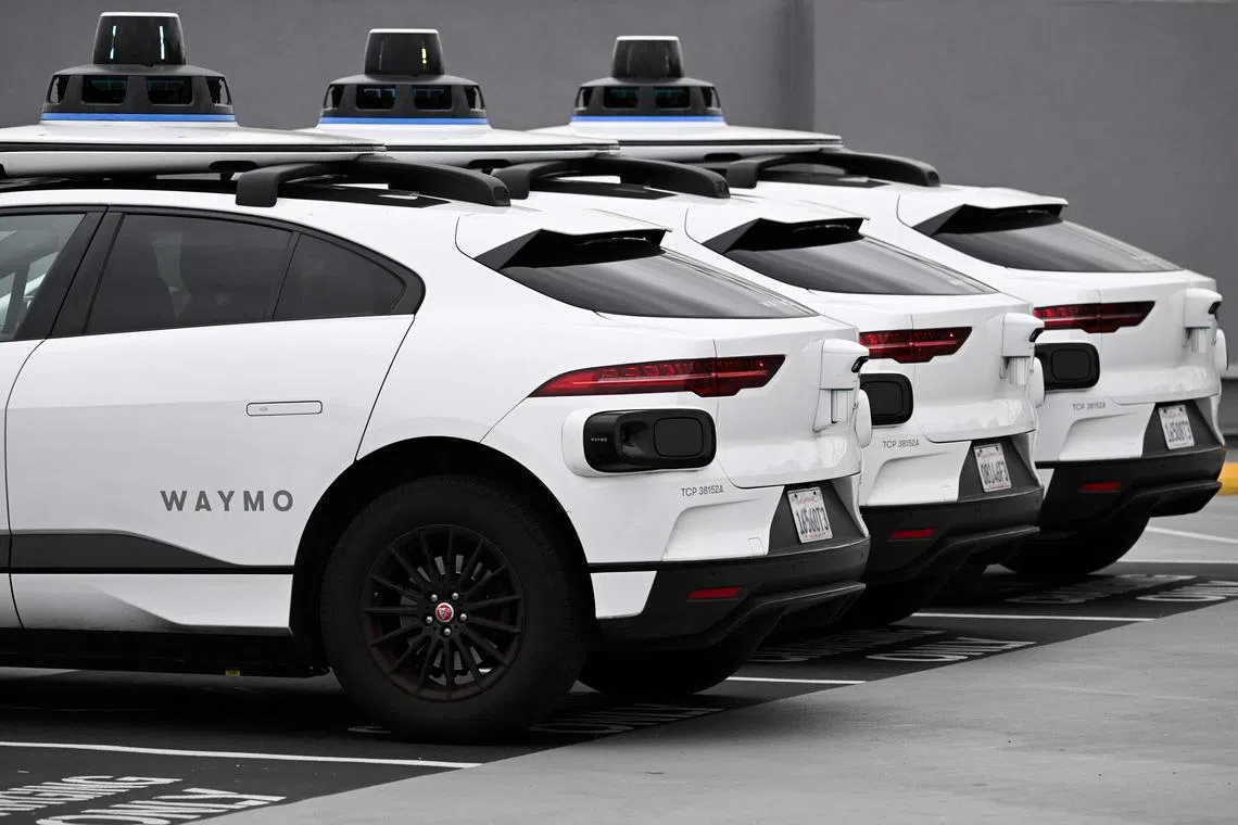 Kenderaan elektrik pandu sendiri milik syarikat Waymo di stesen pengecas EVgo di Los Angeles, California. Waymo kini menawarkan khidmat teksi tanpa pemandu kepada semua pengguna di San Francisco. - Foto AFP