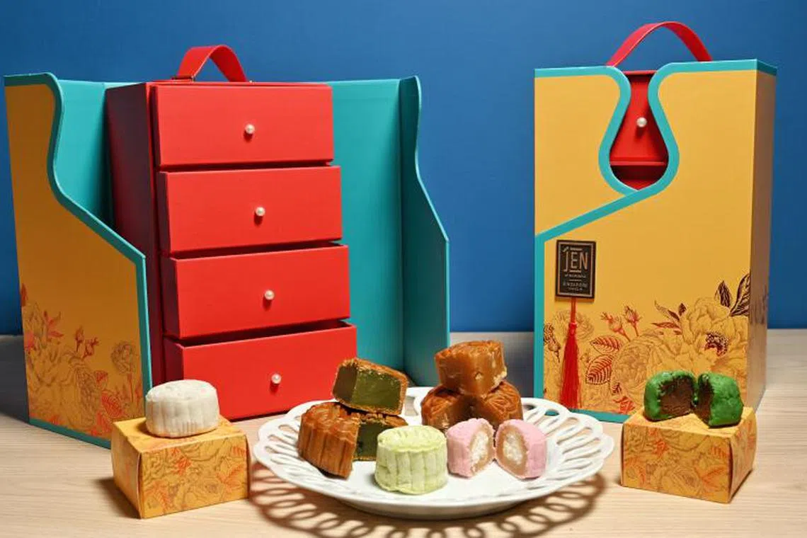 Kuih bulan mewah yang ditawarkan Hotel Jen Singapore Tanglin By Shangri La mempunyai perisa menarik, seperti kuih bulan ‘Milo Dinosaur’ (hijau, kanan). Bungkusannya juga cantik dan mempunyai nilai estetik. - Foto BH oleh KHALID BABA