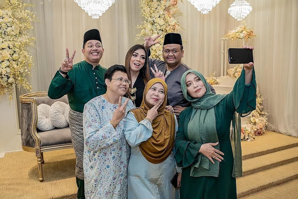 SINAR LEBARAN '23: MakMok Productions yang terdiri daripada (dari kiri, mengikut putaran jam), Zahid Ali, Sasya Foxx, Andree Iskandar, Marzyla Abdul Halim dan Zainab Idris teruja dapat kembali menganjurkan acara Sinar Lebaran '23 pada 19 Mei nanti, yang turut dijayakan penyanyi legenda Wann (memegang telefon bimbit). -