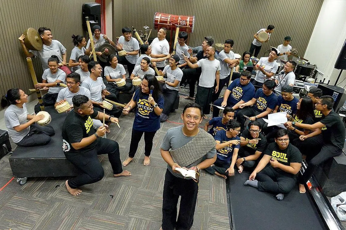 PERTUNJUKAN GENDERANG: Anggota Nadi Singapura, Muhammad Zulfadhli Othman (hadapan), memainkan peranan utama, Taufan, yang akan menyerikan lagi pertunjukan 'Journey 2: The Pulse', gabungan kumpulan genderang Melayu Nadi Singapura dengan pelajar ITE Kolej Central dan ITE Kolej Timur. - Foto TUKIMAN WARJI -