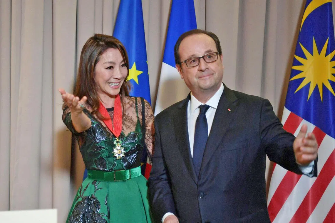 TERIMA ANUGERAH 'LEGION D'HONNEUR': Pelakon antarabangsa Malaysia, Michelle Yeoh, selepas menerima anugerah daripada Presiden Perancis, Encik Francois Hollande, di Kuala Lumpur atas sumbangannya dalam bidang kebudayaan dan industri perfileman. - Foto AFP -