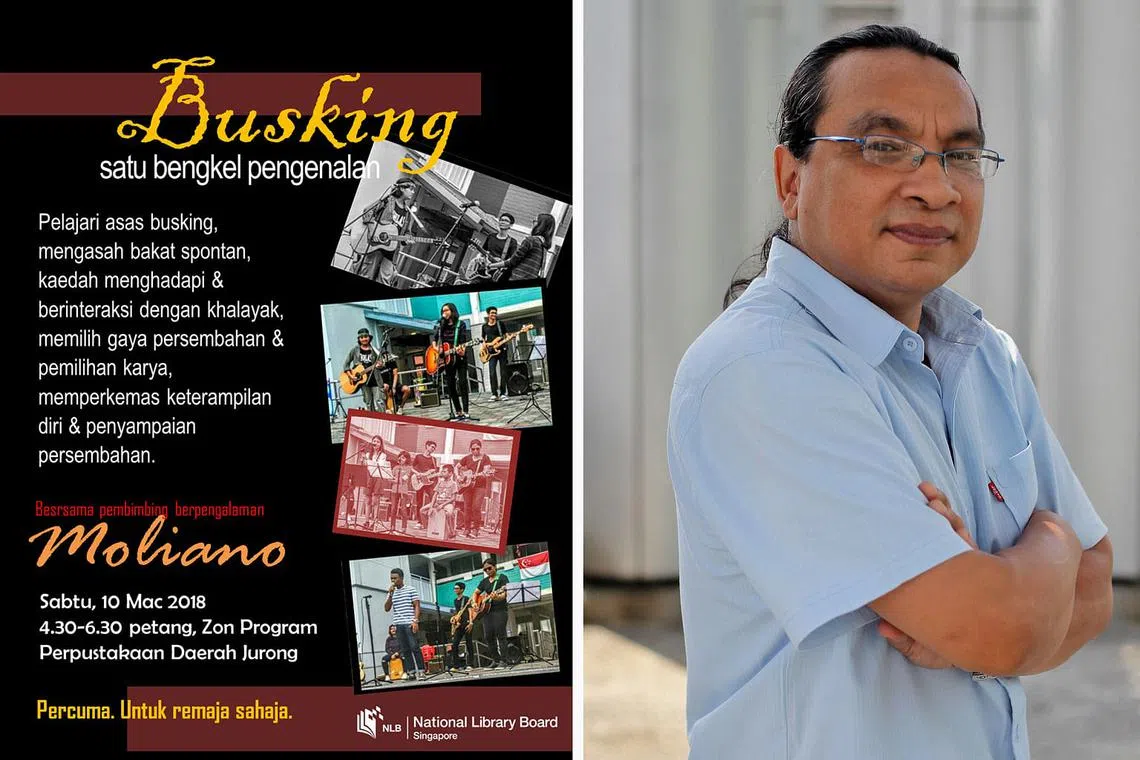 SENI PERSEMBAHAN JALANAN: Bengkel busking akan di adakan esok di Perpustakaan Daerah Jurong yang akan dikendalikan pemuzik Moliano Rasmadi (gambar kanan). - Foto LEMBAGA PERPUSTAKAAN NEGARA, Foto fail -
