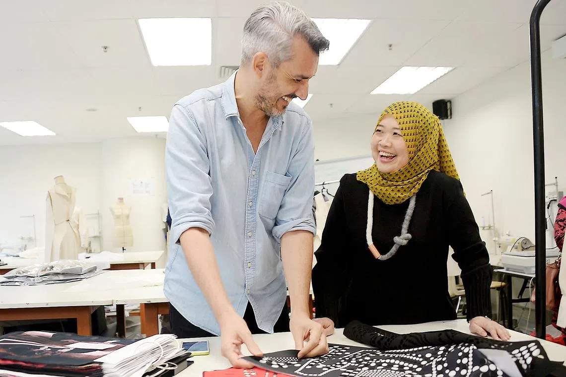 CORAK JIWA BERIHSAN: Dekan Fakulti Reka Bentuk di Maktab Seni Lasalle, Cik Nur Hidayah Abu Bakar, ingin kursus Sarjana Sastera dalam Reka Bentuk yang diberi suntikan baru tahun depan menarik minat pelajar yang prihatin lagi ingin memanfaatkan bidang rekaan sebagai khidmat kemasyarakatan. Bersamanya ialah pemimpin kursus Sarjana Muda Sastera (Kepujian) dalam Rekaan Fesyen, Encik Lionel Roudaut. - Foto ZAINAL YAHYA -