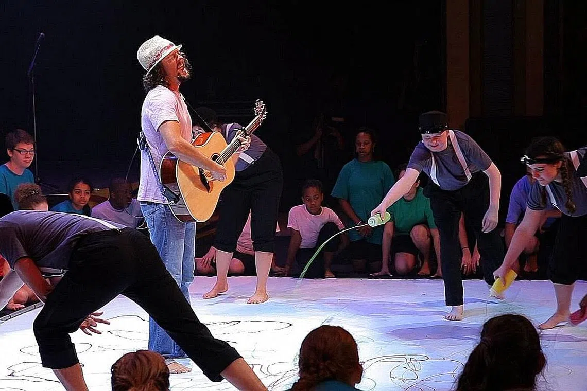 DUKUNG USAHA KEMASYARAKATAN: Jason Mraz (memetik gitar) yang aktif membangunkan program seni persembahan 'LIVE ART' di bawah yayasan kemasyarakatannya ingin memperkasa golongan pelajar istimewa menerusi seni lantas teruja dipelawa menjadi penghibur bagi pembuka tirai Sukan Musim Sejuk Sedunia Olimpik Khas di Austria pada 18 Mac ini. - Foto LAMAN JASON MRAZ.COM -