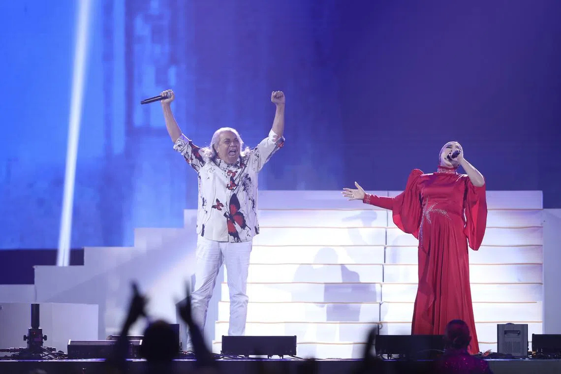GANDINGAN MEMUKAU: Apabila Papa Rok, Datuk Ramli Sarip (kiri) dan Azharina Azhar, berpadu suara bagi lagu rok ikonik, ‘Kamelia’, dalam konsert akhir ‘All Stars Gegar Vaganza’ (ASGV), sejarah bagai tercipta. - Foto ASTRO