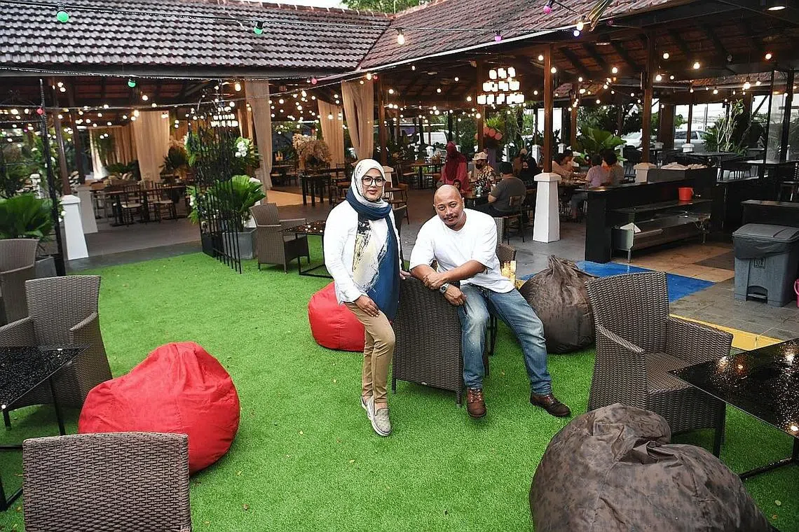 KERJA KERAS: Cik Fatimah Mohsin bersama suaminya, Encik Mohamad Shahary Ahmad, bekerja keras menghiasi dan memikirkan konsep sesuai bagi restoran baru mereka, 555 Halal Thai, di Gallop Kranji Farm Resort. Gambar sisipan menunjukkan salah satu hidangan udang yang ditawarkan di restoran itu. - Foto BM oleh KHALID BABA -
