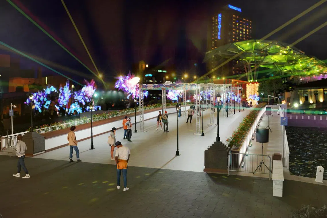 Pengunjung boleh menikmati pertunjukan cahaya di Jambatan Cavenagh dan Jambatan Alkaff serta beberapa persembahan muzik di Boat Quay.