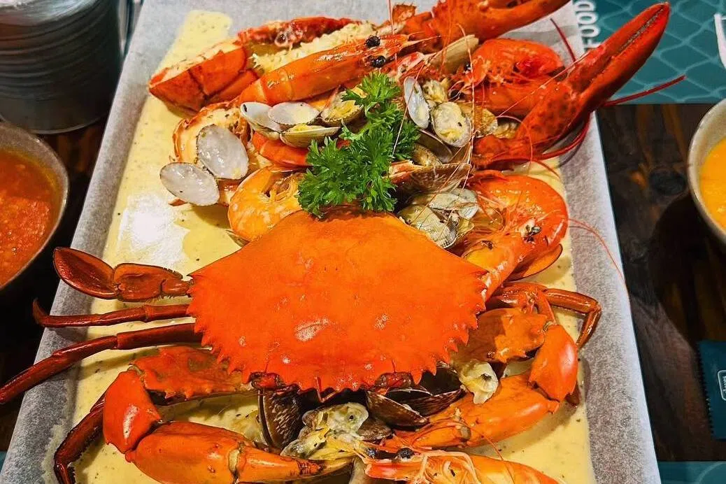 Harga: XXL Fisherman Sampan sesuai untuk lima atau enam orang, mengandungi empat ketam Sri Lanka (400g setiap satu), seekor udang karang Boston (500g), udang, lala, kupang, scallop, roti mantou, makaroni, serta pilihan sos kegemaran – semua ini ditawarkan pada harga $248.