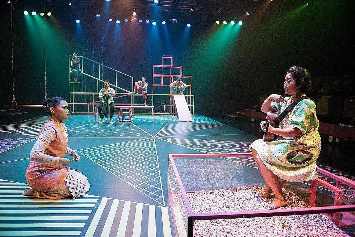 PERMAINAN HIDUP: Main² ,yang dipentaskan dalam suasana pentas yang diubah persis taman permainan, dijayakan oleh Farhana M. Noor (kiri) dan Suhaili Safari dengan penuh penghayatan . - Foto JACK YAM/ESPLANADE -