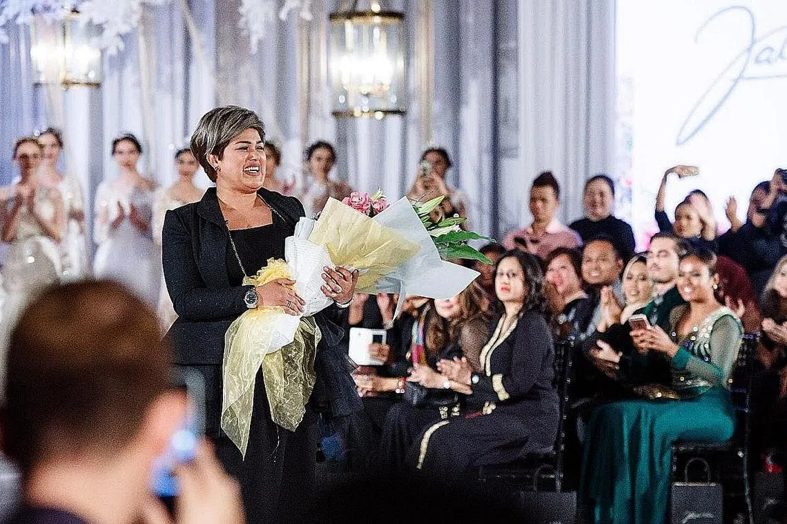 PERAGAAN SOLO PERTAMA DI LUAR NEGARA: Cik Fatimah Mohsin (kiri) satu-satunya pereka busana pengantin Singapura yang diundang bagi acara 'KL Wedding 2017' yang diadakan pada 3 Mac hingga 5 Mac lalu di Hotel Mandarin Oriental Kuala Lumpur. - Foto-foto ALLIAMAZING CREATIVE PHOTOGRAPHY, PROJECT TWO-PI -