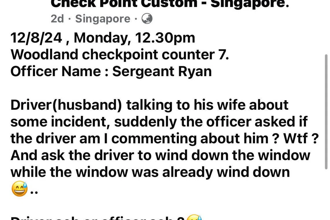 Dalam catatannya di Facebook (FB), pemandu itu berkata beliau memandu melalui Pusat Pemeriksaan Woodlands dan sedang bercakap dengan isterinya “mengenai beberapa kejadian” sekitar 12:30 tengah hari pada 12 Ogos apabila pegawai itu didakwa bertanya sama ada pasangan itu bercakap mengenainya.