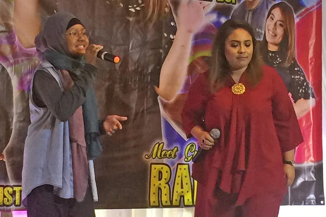 DUET SPONTAN: Nurul Rahila Rashun (kanan) mengalunkan 'single' sulungnya, 'Langit Sampaikan', bersama penyanyi remaja bersuara merdu, peserta 'Asia's Got Talent', Nur Umairah Mohammad Shafiq. - Foto HARYANI ISMAIL -