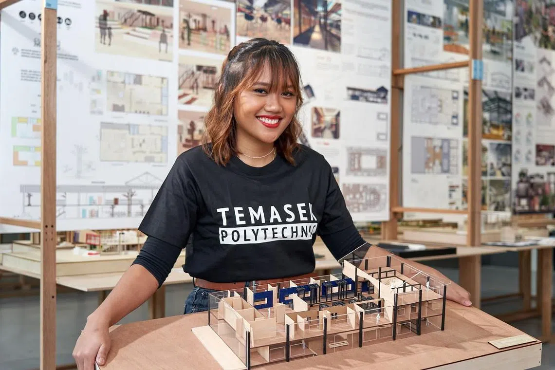 FIKIRKAN CITA RASA GENERASI MILENIAL: Cik Nur Amirah Natasha Alfian teruja mewujudkan model ruang kerja dan tempat tinggal bersama buat karyawan firma permulaan atau 'start-up' yang dambakan kesederhanaan hidup apabila harga hartanah melonjak. - Foto POLITEKNIK TEMASEK -