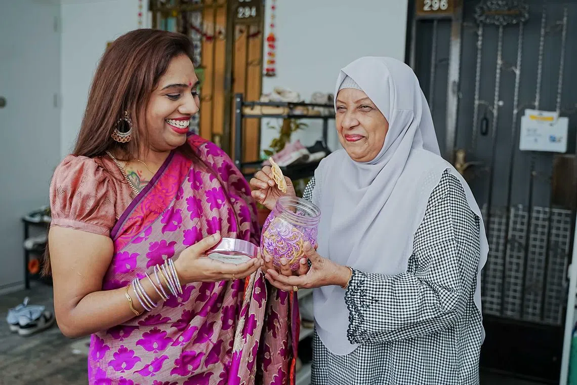 Begitulah kehidupan berjiran penuh mesra yang dibina Cik Komathi Manivasan, 44 tahun, dan Cik Zaiton Ahmed, 67 tahun, di sebuah blok Lembaga Perumahan dan Pembangunan (HDB) di Sengkang West.