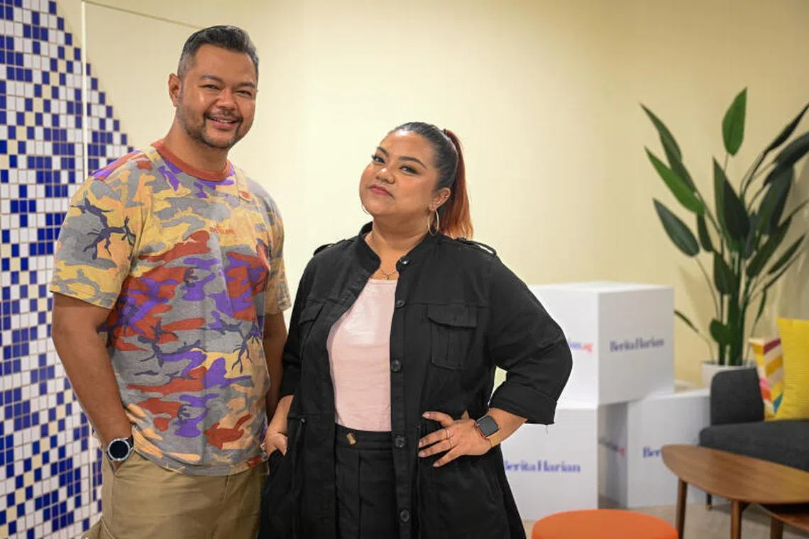 GANDINGAN SERASI: Hazrul Nizam (kiri) dan Dina Nadzir membina keserasian dalam menyanyikan lagu duet ‘Berat Hati’, hasil keakraban persahabatan yang terjalin sejak menyertai Gegar Vaganza 9 (GV9) - Foto BM oleh SHAFIQ APANDI