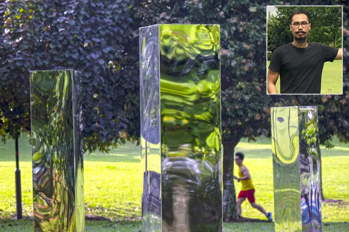 BELAJAR ERTI KERJASAMA: Encik Muhammad Nhawfal Juma'at (gambar sisipan) tidak mampu bersikap egois dan mementingkan ideanya sahaja dalam menghasilkan kerja seni pemasangan di Taman Woodlands Waterfront yang memberi cerminan tentang kehidupan, kediaman dan perpaduan. Ia dijana dengan kerjasama pasukan kontraktor dan jurutera dan meraih inspirasi daripada struktur agama dan budaya. - Foto-foto MAJLIS SENI KEBANGSAAN, HARYANI ISMAIL
