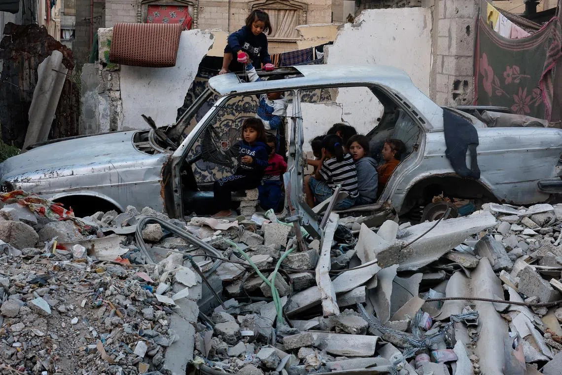 Kanak-kanak berkumpul dalam kenderaan yang musnah di tengah-tengah konflik Israel-Hamas di Khan Younis di selatan Jaluran Gaza pada Oktober 2024. - Foto REUTERS
