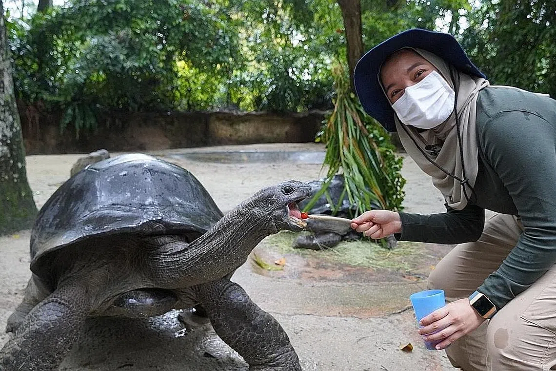 KURA-KURA GERGASI: Antara haiwan yang wartawan temui dan diberi peluang memberi makan adalah kura-kura gergasi Aldabra, Mahe, yang sudah berusia lebih 80 tahun. -