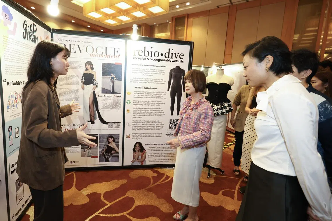 Menteri Negara Kanan (Kemampanan dan Sekitaran merangkap Pengangkutan), Dr Amy Khor (dua dari kiri), selaku tetamu kehormat berinteraksi dengan salah seorang finalis, Anugerah Cabaran Pelajar Majlis Fesyen Singapura di sidang puncak, ‘Be The Change’, pada 15 Ogos di Pusat Konvensyen dan Ekspo Sands. - Foto SFC