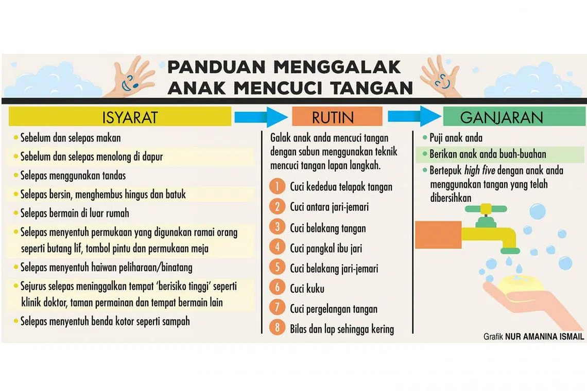 CUCI tangan selepas menggunakan tandas dan sebelum makan antara amalan kebersihan yang harus diterapkan dalam diri kanak-kanak sejak kecil lagi.