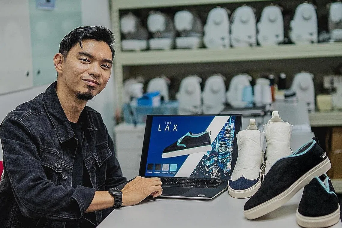 SIAPKAN REKAAN, BENTANGKAN HURAIAN: Sebagai penggiat sukan papan lungsur yang prihatin tentang masalah tali sniker putus kerana aksi lasak melungsur, Encik Siraj Munir hasilkan rekaan sniker yang mampu menyembunyikan tali dalam kasut. - Foto BH oleh NUR DIYANA TAHA -