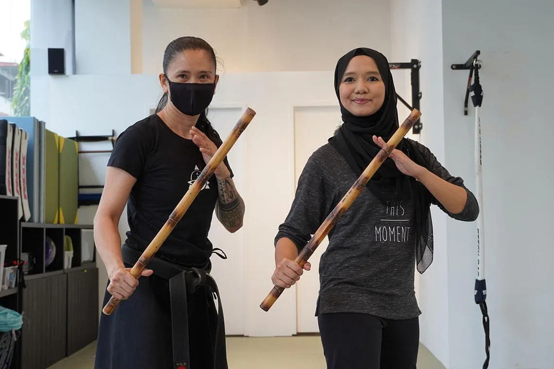 BAK SRIKANDI: Koresponden Shahida Sarhid (kanan) bersama pelatih, Cik Rose daripada Kali Majapahit bergambar dengan batang kayu yang diperbuat daripada rotan selepas sesi latihan. - Foto BH -