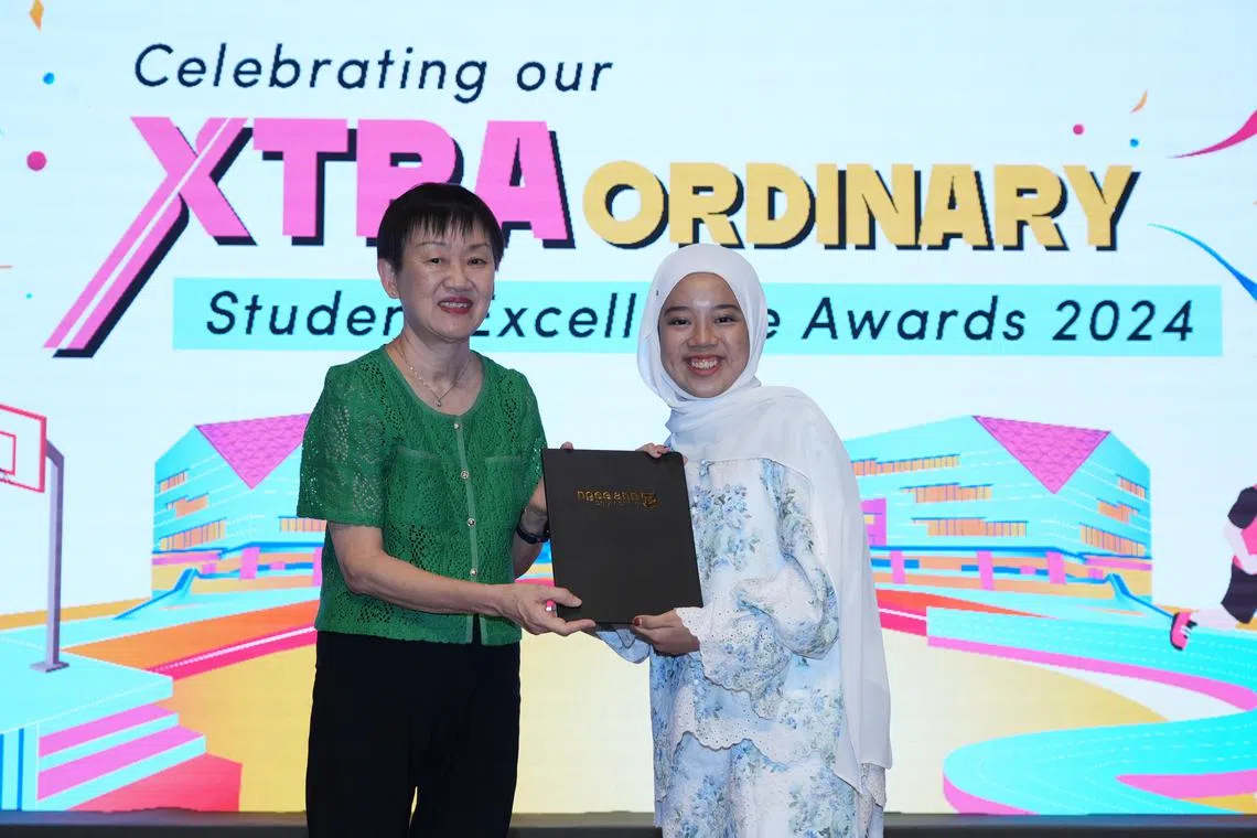 Cik Camelia Sephiana Nor Azmi (kanan), menerima Anugerah Pujian Khas: Khidmat Masyarakat daripada Politeknik Ngee Ann (NP) yang meraikan pencapaian ke-20 Anugerah Kecemerlangan Pelajar (SEA) pada 18 Julai, disampaikan oleh Pengarah Kanan Pelajar NP, Cik Tang-Lim Guek Im. - Foto POLITEKNIK NGEE ANN