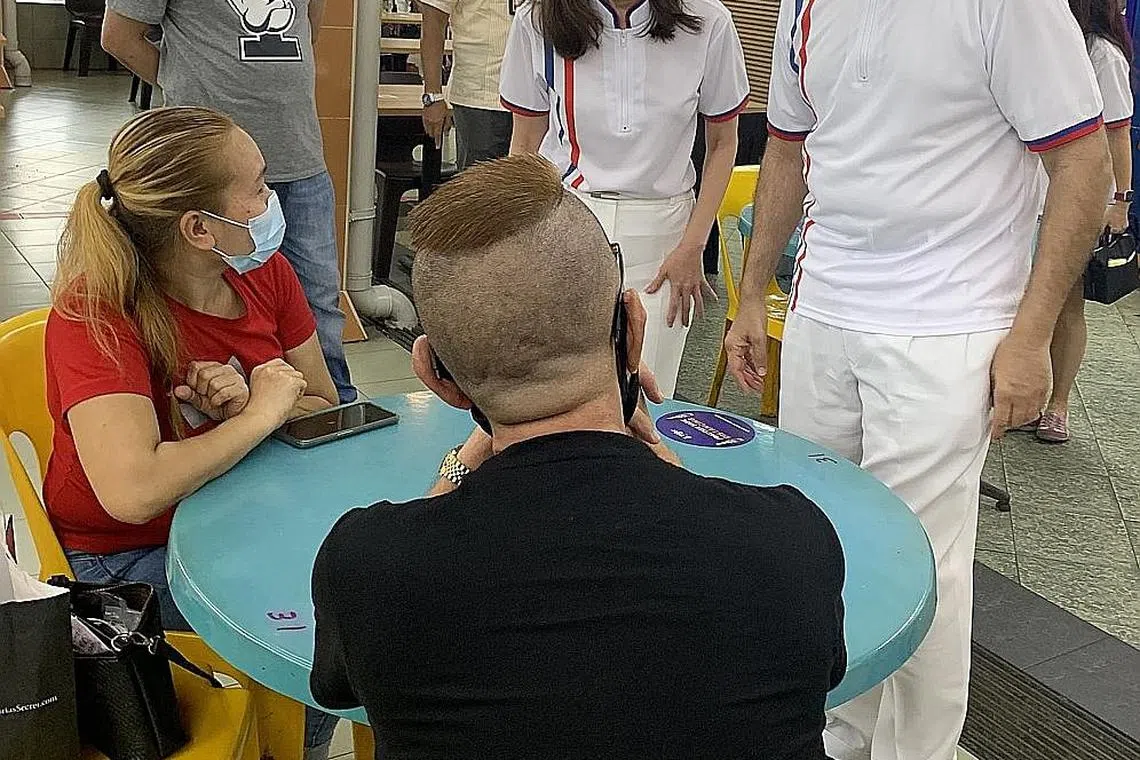 TEMUI PENDUDUK: Encik Iswaran dan Cik Rachel Ong (kedua-duanya berbaju putih) beramah-tamah bersama penduduk di Pusat Makanan Dover. - Foto SHIN MIN DAILY NEWS -