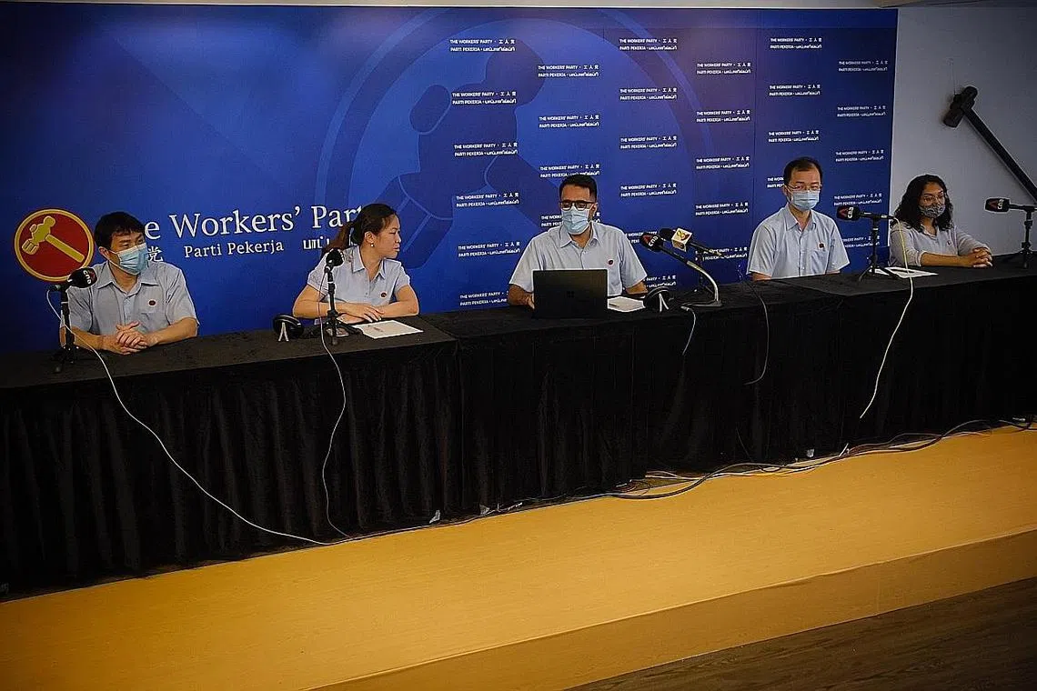 MAHU GANDING BAHU: Encik Pritam Singh (tengah) bersama pasukan WP yang menang di GRC Sengkang, dianggotai (dari kiri) Dr Jamus Lim, Cik He Ting Ru, Encik Louis Chua, dan Cik Raeesah Khan, dalam satu sidang media menerusi Zoom, semalam. - Foto BH oleh MARK CHEONG -