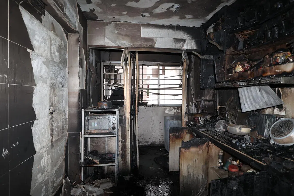 DIJILAT API: Kebakaran di sebuah flat HDB di 229A Sumang Lane “melibatkan dapur memasak yang terlalu panas” dan telah dipadamkan dengan pancutan air. - Foto SHIN MIN