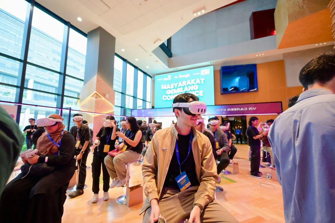 ALAM MAYA: Peserta di Persidangan Masyarakat Gemilang mengenakan alat mendengar realiti maya (VR) sambil melibatkan diri dalam temu bual maya daripada pelbagai sektor. - Foto MENDAKI
